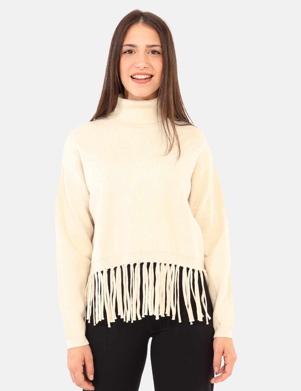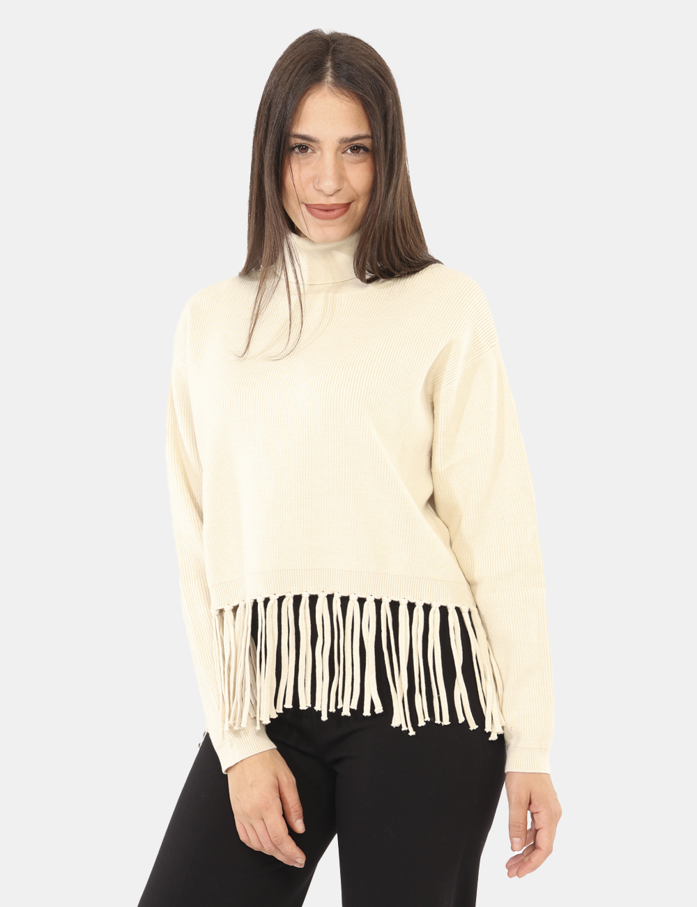 Maglione dolcevita corto con frangia in total beige. La vestibilità è morbida e regolare. Il maglione è adatto per occasioni casual e facilmente combinabile. Praticità e stile in un solo capo.