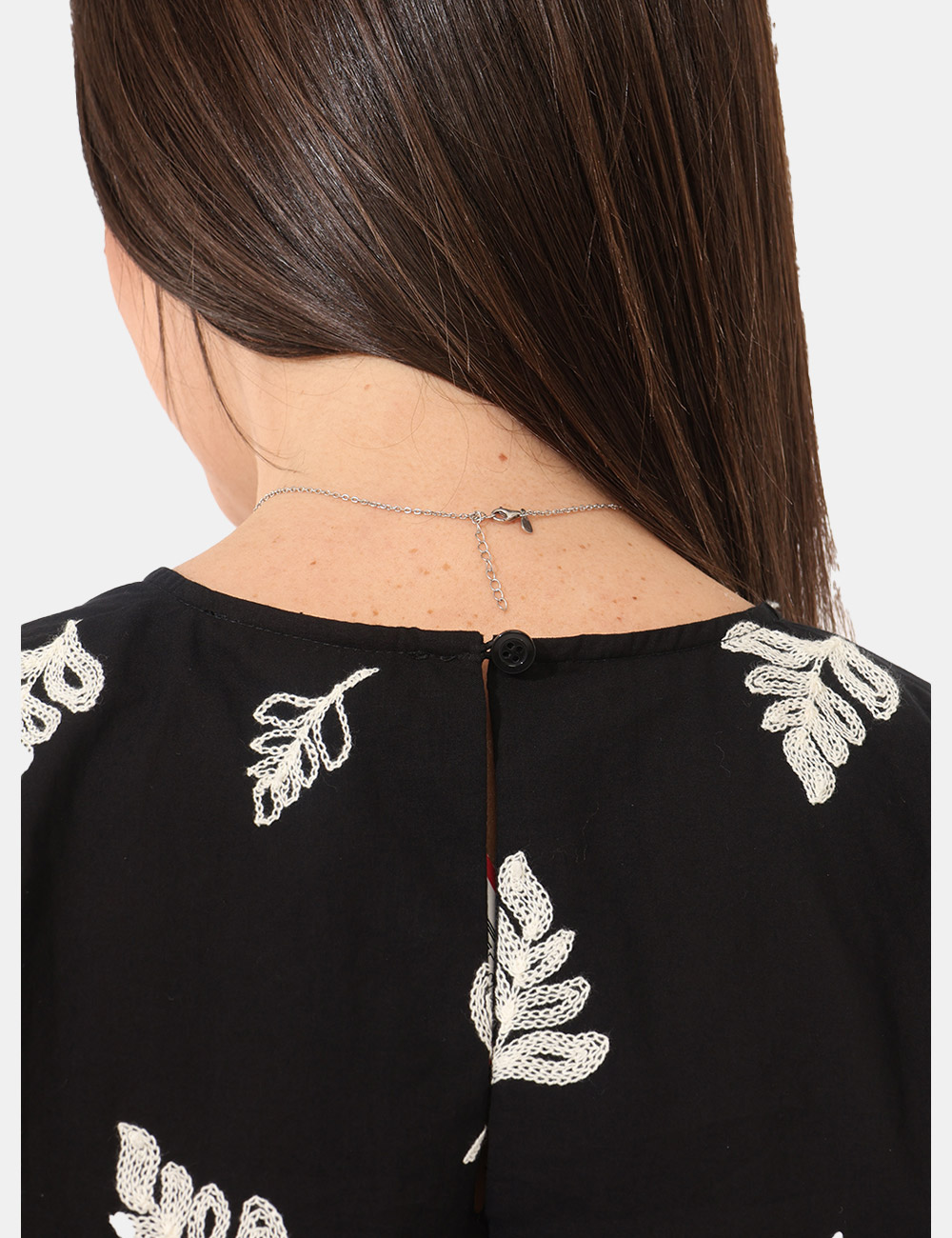 Il top con mezza manica, ricami allover bianchi, bottone ad asola sul retro è perfetto da indossare nel tempo libero di giorno, per un look curato ma comodo, oppure di sera con accessori minimal per un risultato più elegante. Puoi abbinarlo a shorts coordinati e sandali per un outfit fresco e armonioso, oppure scegliere jeans e sneakers per uno stile casual chic sempre attuale.